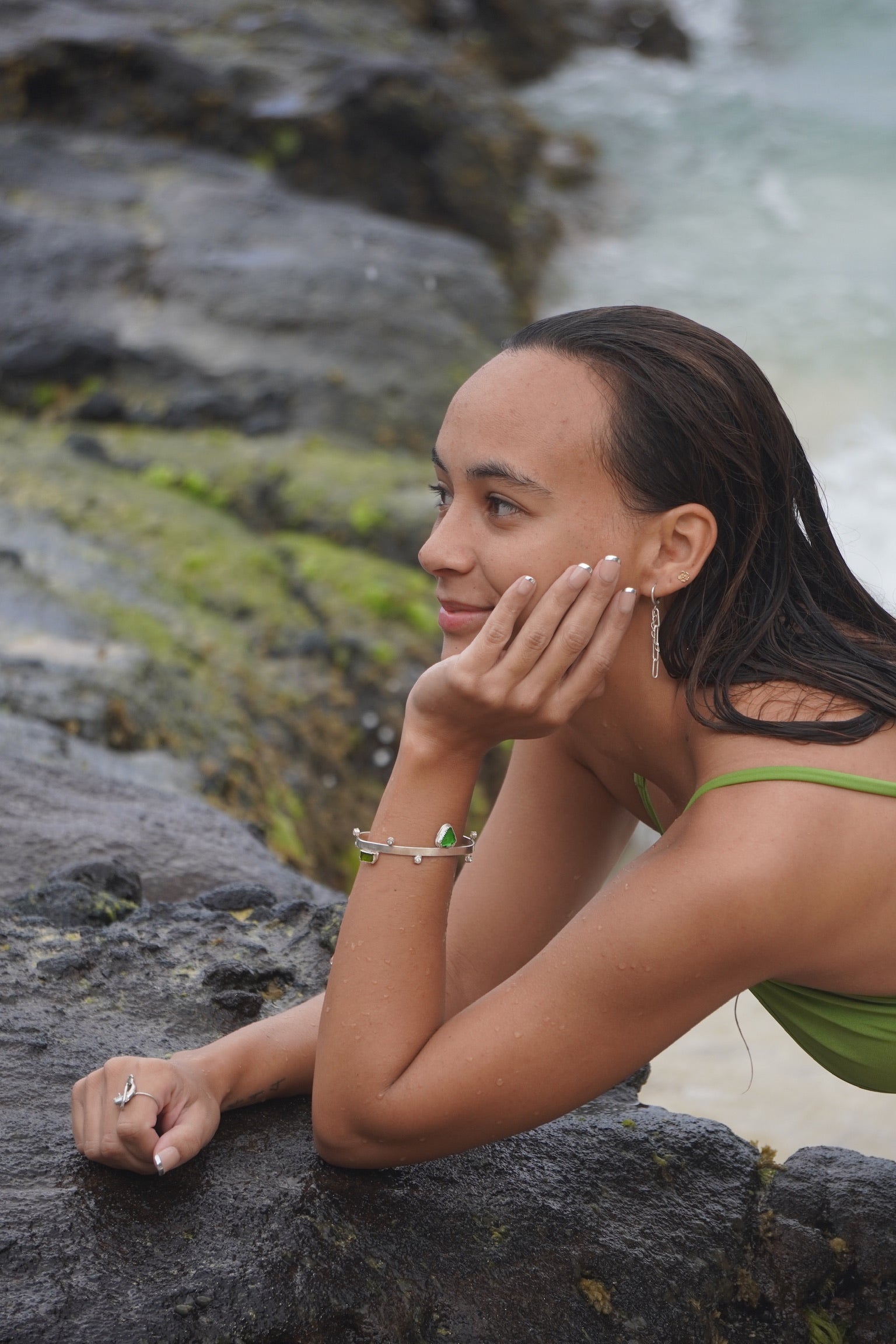 When you let go of the old to welcome the new, you embrace unconventionality, authenticity, and plenty of inner rewiring. Creating this sterling silver cuff reminded me to trust the art and stay flexible, returning and staying true to oneself. Adorned with sparkling cubic zirconia drops and bordered by two green sea glass pieces, this piece is a celebration of transformation and aligning with a renewed sense of spunk. May it inspire you to embrace your own journey of renewal.