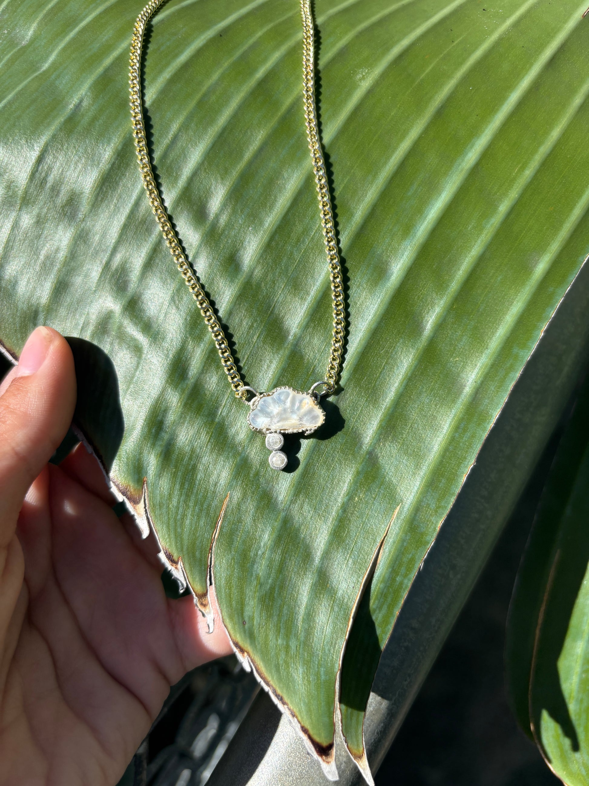 Inspired by Job 37:14–16, this gold-filled necklace invites you to pause and reflect on the unfathomable beauty of God’s design. Think about it—God controls the clouds, lightning, and weather in ways far beyond human understanding. A luminous mother-of-pearl cloud anchors the piece, with cubic zirconia accents cascading like divine raindrops, reflecting the mystery held in every storm and sky. The curb chain symbolizes strength and connection, grounding the heavenly wonder above with the path we walk below.