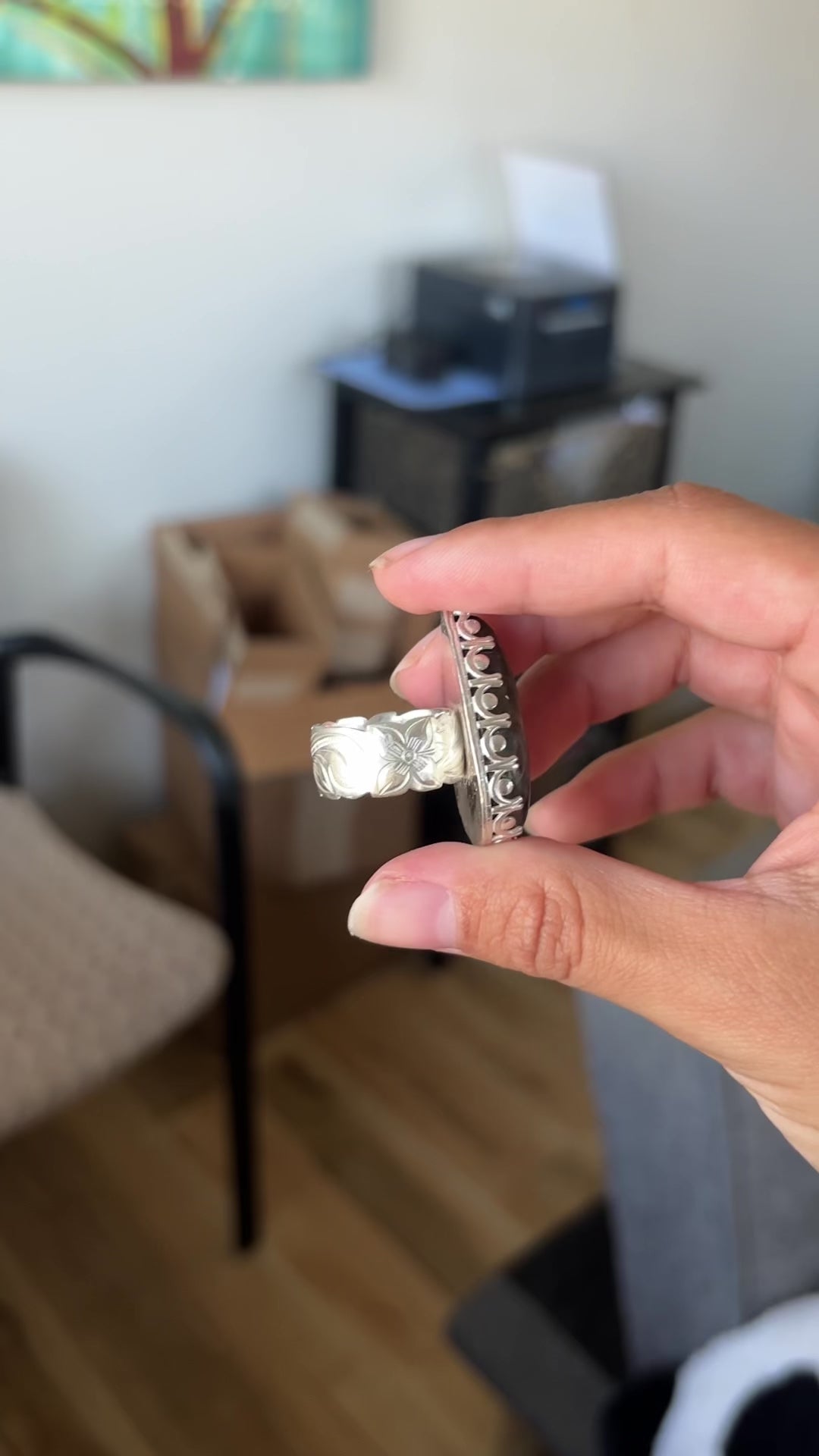 "Haumea who nourishes the earth." This one-of-a-kind ring, inspired by Haumea, the Hawaiian goddess of creation and fertility, features a mesmerizing multi-flash labradorite stone. The giant pear-shaped labradorite, with its vivid flashes of yellow, green, and purple, embodies her divine nature and widespread influence. The engraved pua, kalo leaves, and half-spiral patterns adorn the band, symbolizing Haumea’s regenerative, nourishing energy and connection to the cycles of life. Subtle hammered textures and polished accents echo the interplay of light in the stone, making this piece a wearable celebration of growth, transformation, timelessness, and Hawaiian heritage.