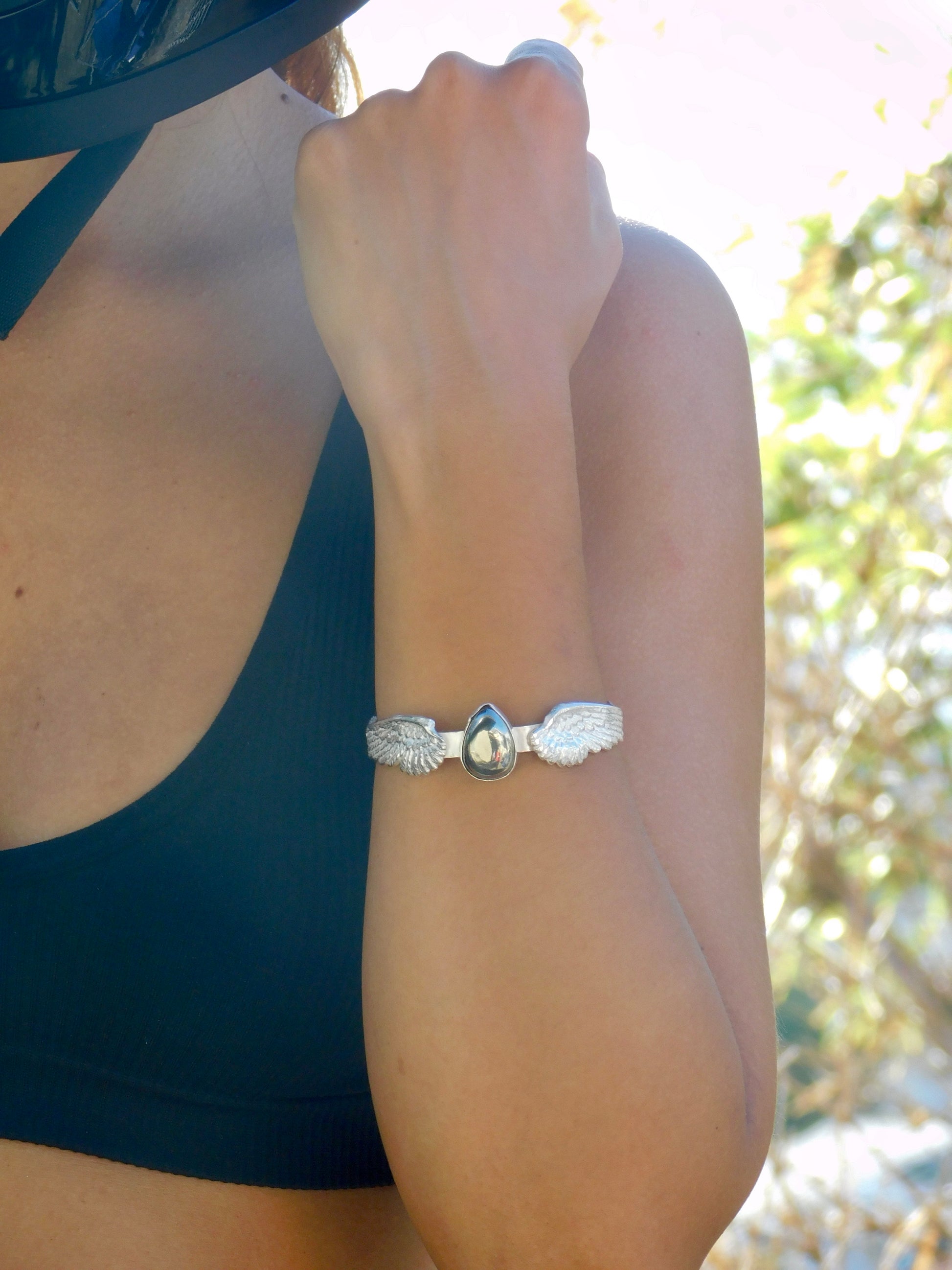At the center of this cuff is a striking Pyrite stone, known for its fiery energy that enhances life-force, confidence, and willpower. It’s a protective stone that promotes manifestation, inspires action, and stimulates creativity while radiating the power of the Sun. If you’re facing anything weighing you down, let this cuff remind you to trust your wings and embrace the courage to fly.