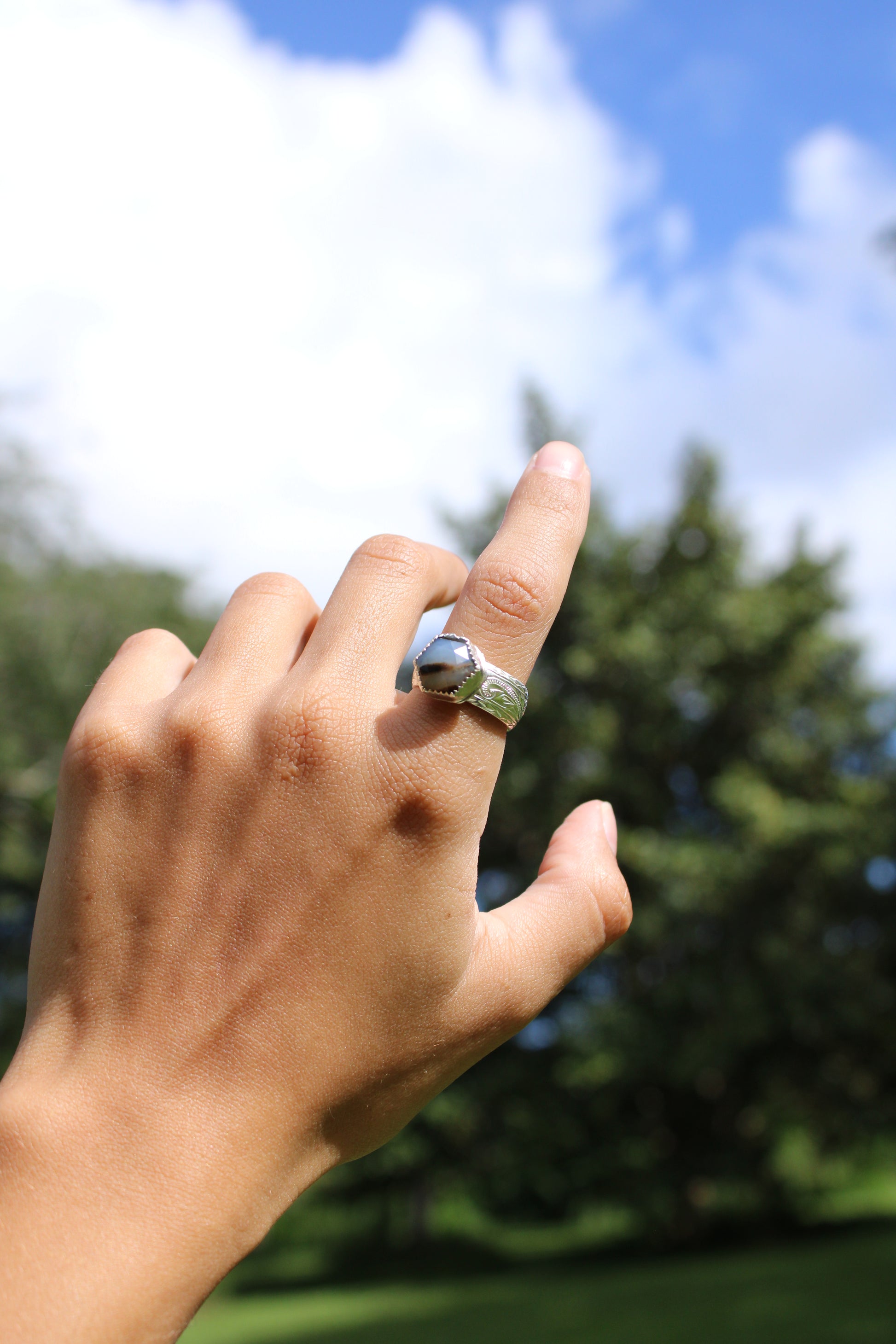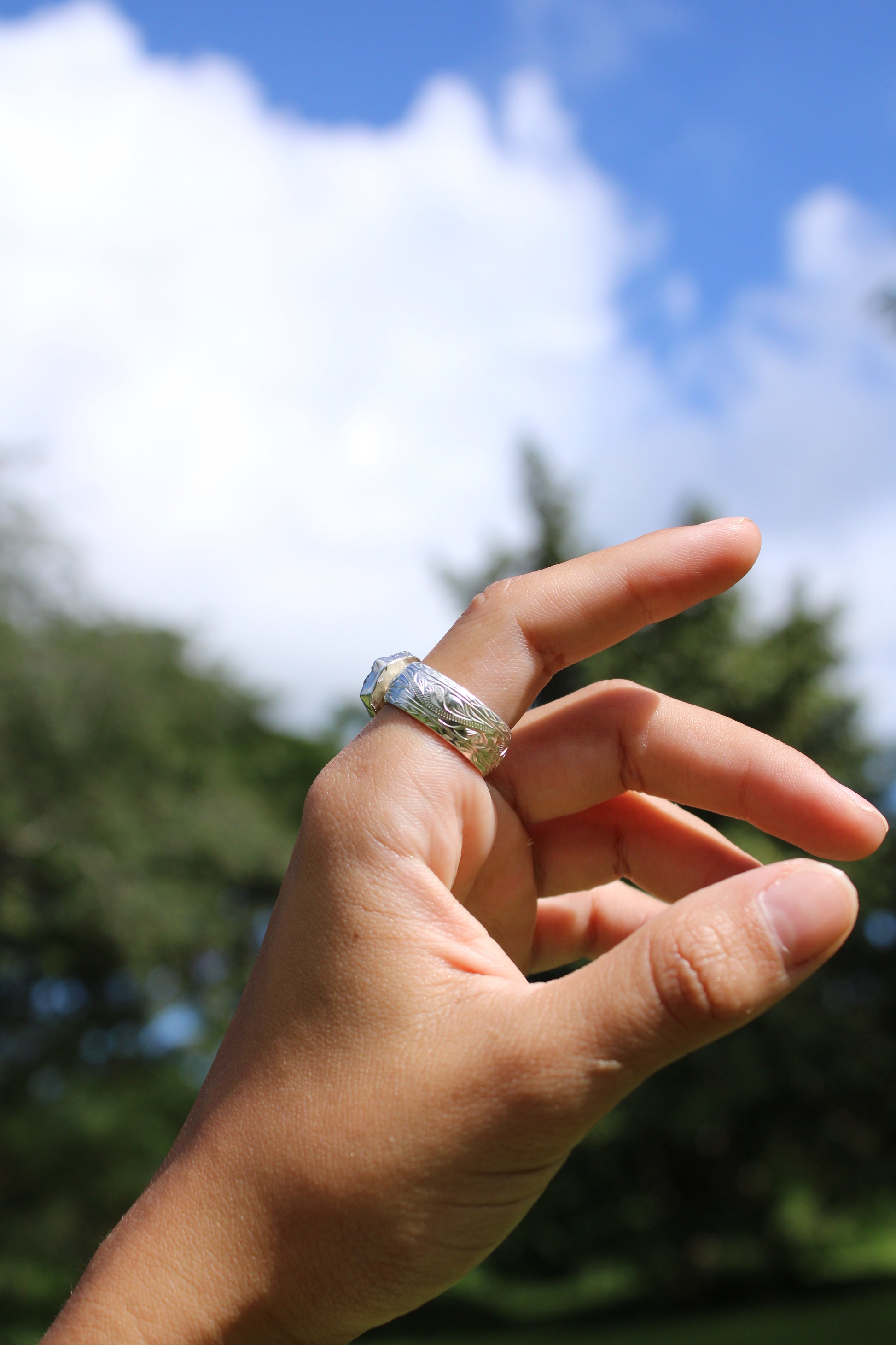 This sterling silver one-of-a-kind ring celebrates Kāne, the Hawaiian god of creation and life. At its heart lies a purposeful hexagon-shaped Peruvian opal, a symbol of harmony and interconnectedness, much like Kāne’s life-giving role in nature. The opal’s captivating blue and brown hues evoke fresh water (wai) flowing through basalt rocks, a reminder of Kāne’s essence as the provider of vitality.