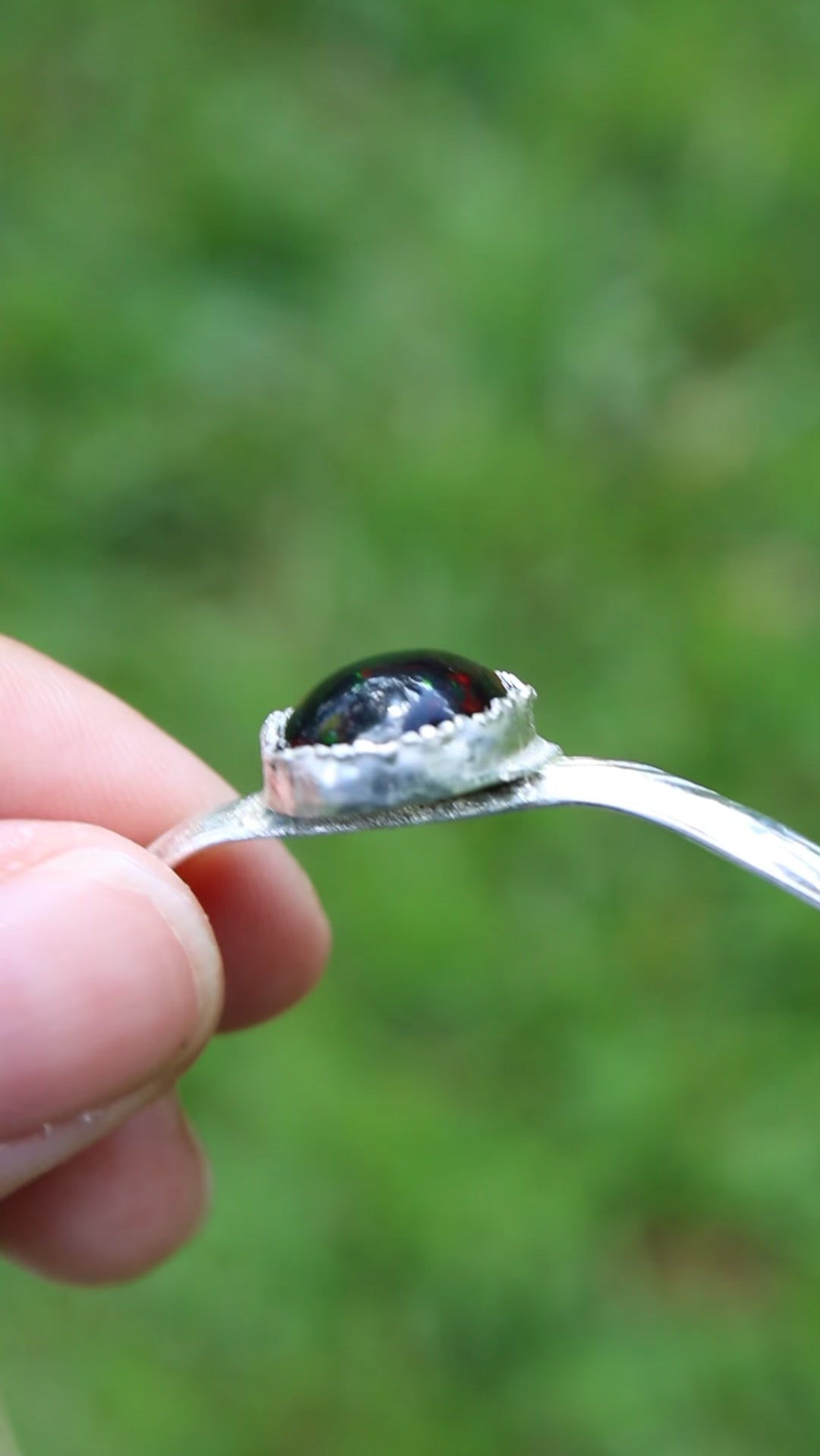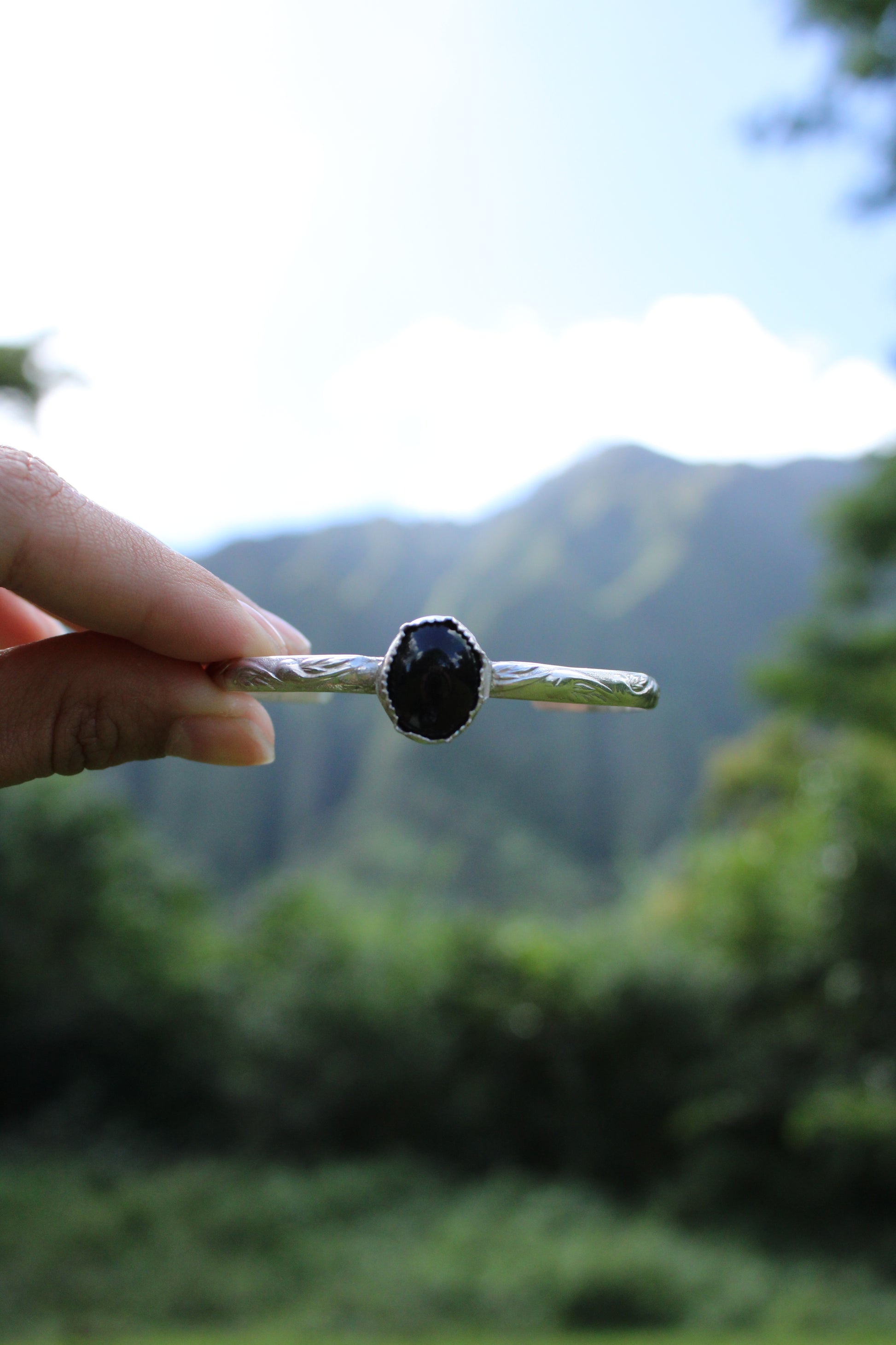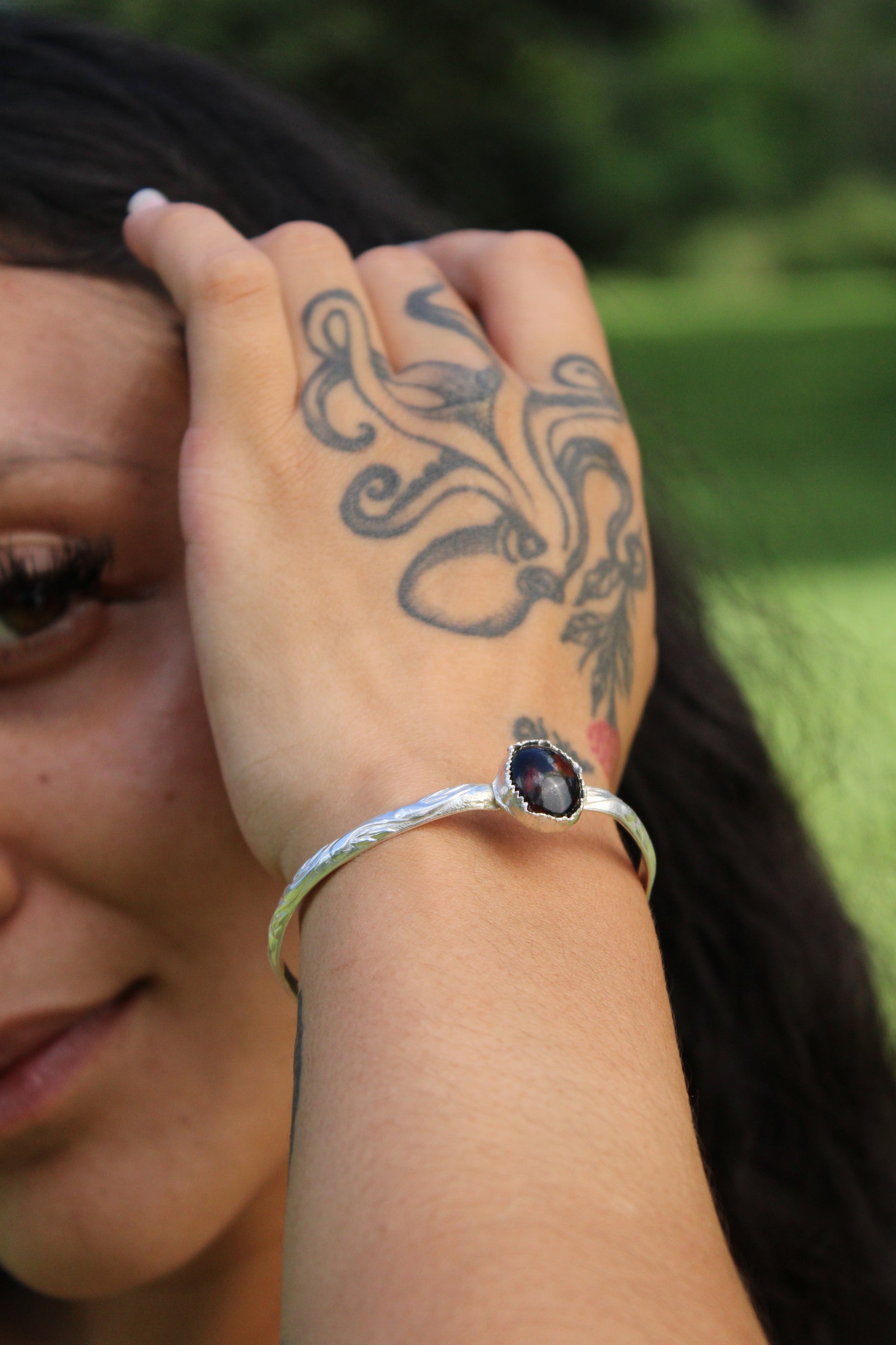 This one-of-a-kind cuff honors the transformative power of Pele, the goddess of fire and volcanoes. Inspired by her dual nature as both creator and destroyer, the sterling silver cuff features a flowing “lava” band, a jagged “rock” bezel, and a striking molten lava galaxy opal at its heart. Each element reflects Pele’s ability to burn away the old and shape the new, embodying her boldness and fiery passion. Named Pele-honua-mea (Pele of the sacred land), this piece celebrates her sacred connection to the land, inviting the wearer to channel their strength, boldness, and creativity.
