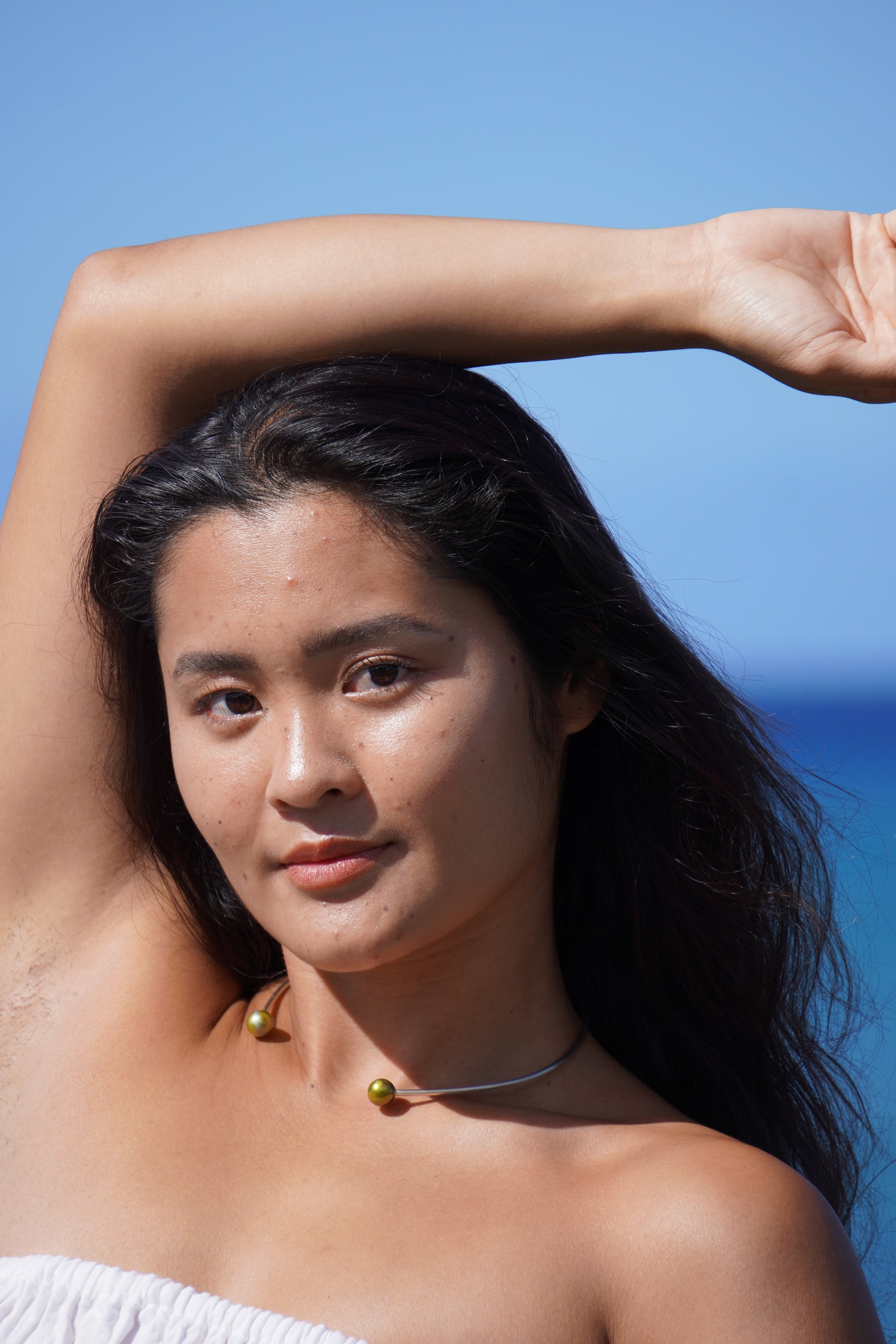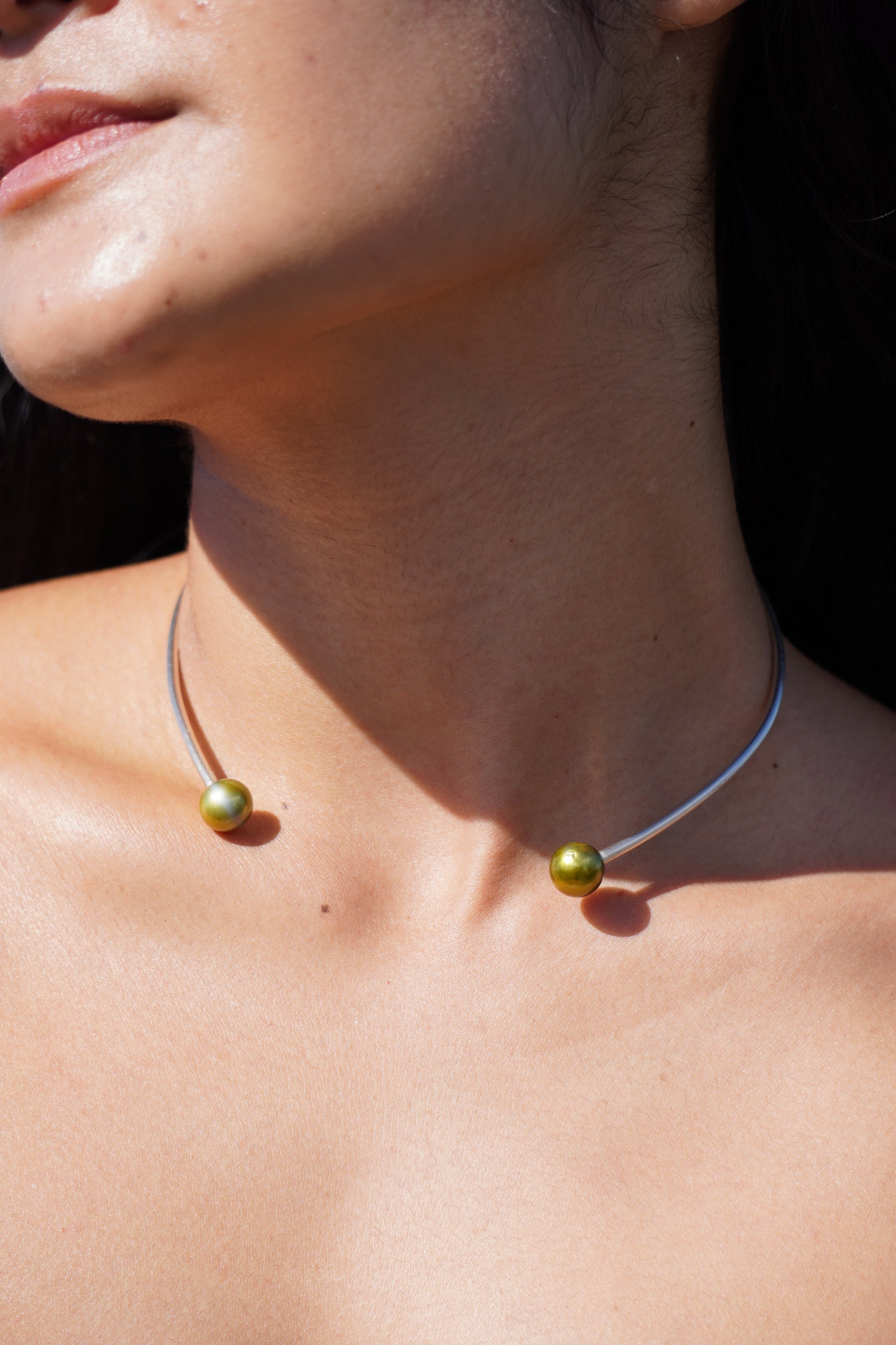 Pearls are 10mm Tahitian round pistachio on a 10 gauge 12in. sterling silver wire cuff choker.