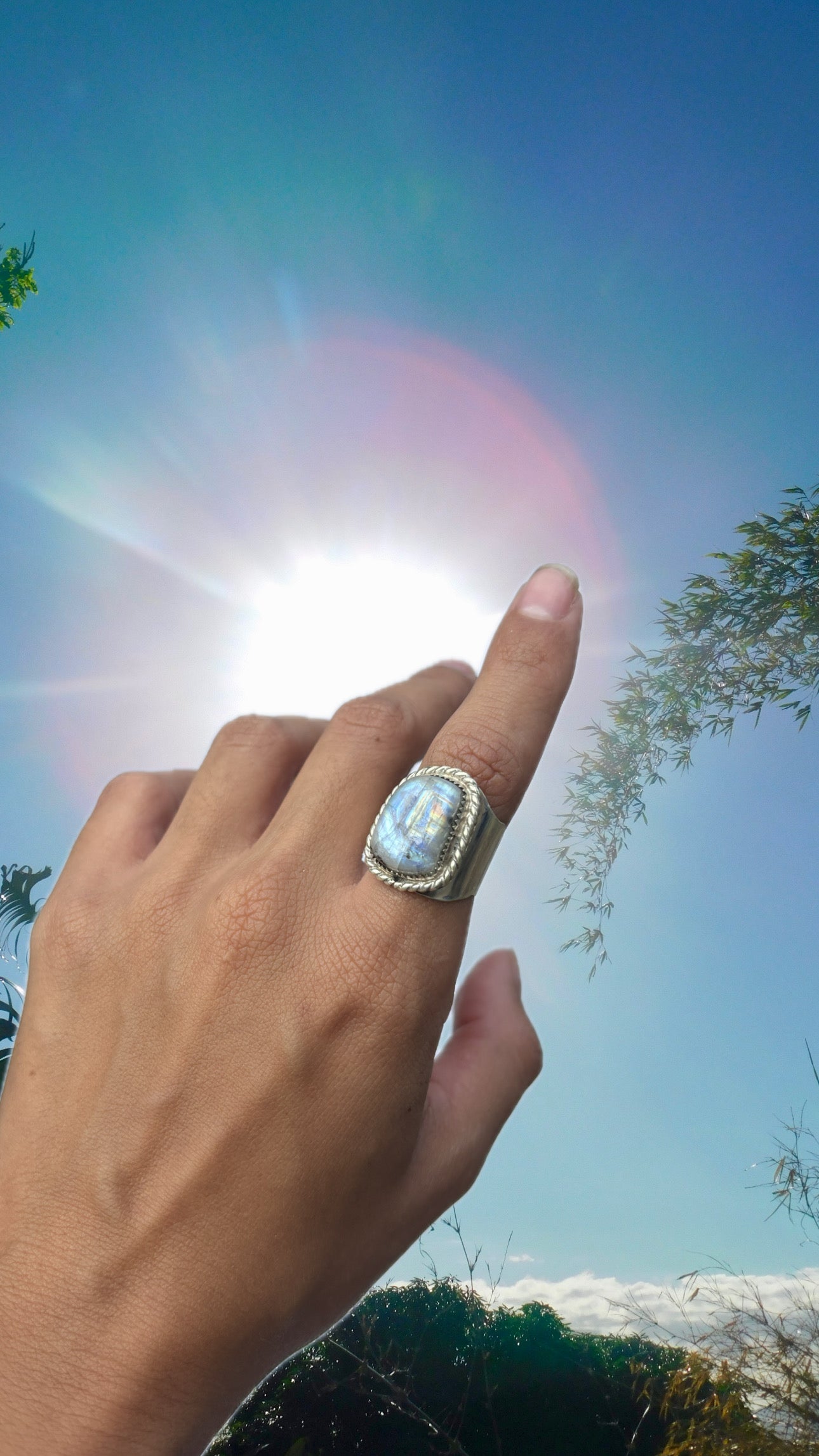 The Radiant Roots Ring, featuring a mesmerizing rainbow flash moonstone, gently reminds you that trying your best is always enough. It’s okay to simply survive, to just get by—your strength shines through in every moment. Crafted in sterling silver, this bold statement piece serves as a grounding guide, returning you to your roots when life feels uncertain. Its luminous stone reflects the inner fire of your passions, lighting your path and inspiring resilience. This ring encourages you to stay afloat, embrace the journey, and find strength in the light you carry within.