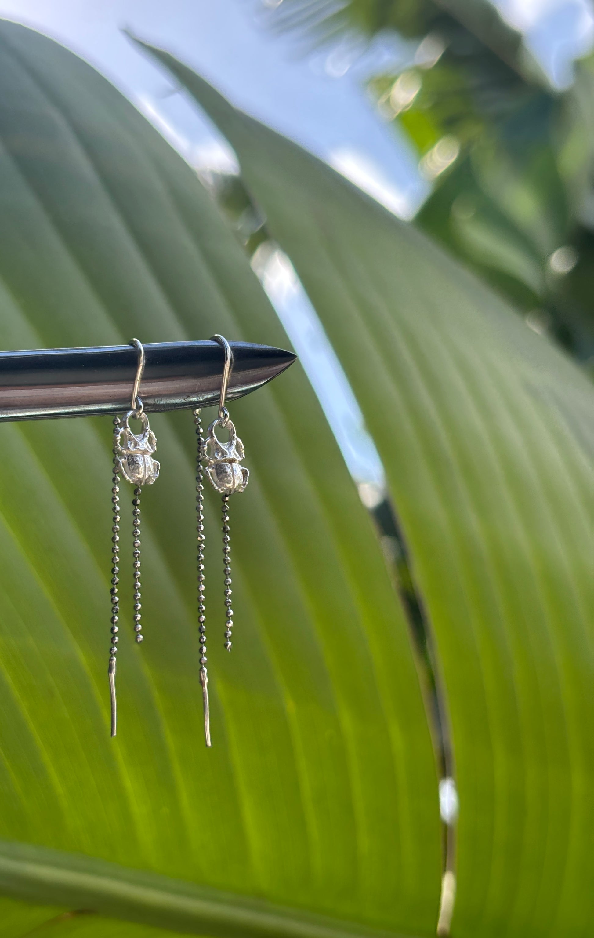 These sterling silver threader earrings feature finely detailed scarab beetles—ancient symbols of protection, strength, and transformation. Known for their tough outer shell, the scarab reminds us that resilience doesn’t mean losing beauty or softness; it means carrying grace through pressure. Each movement of these earrings is a quiet statement: strength can be gentle, and elegance can be unbreakable. Wear them as a reminder that what shields you also shapes you—and that even the smallest creatures are crafted with divine intention.
